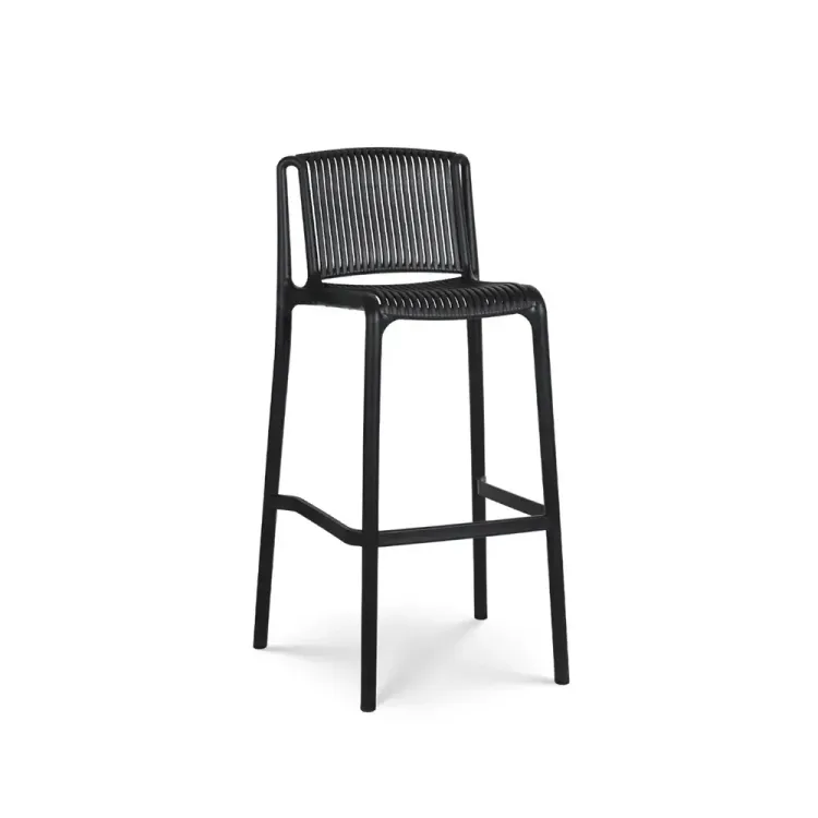 El Butaco para Barra Ariel es una pieza de mobiliario moderna y funcional, ideal para cocinas tipo americano, barras, islas, terrazas o restaurantes. Su estructura está fabricada en polipropileno de alta resistencia, con un diseño tipo cuerda en el asiento y respaldo que le da un aspecto contemporáneo y ventilado. Este butaco para barra destaca por su comodidad gracias a su respaldo bajo y ergonómico, así como por su ligereza y facilidad de mantenimiento.