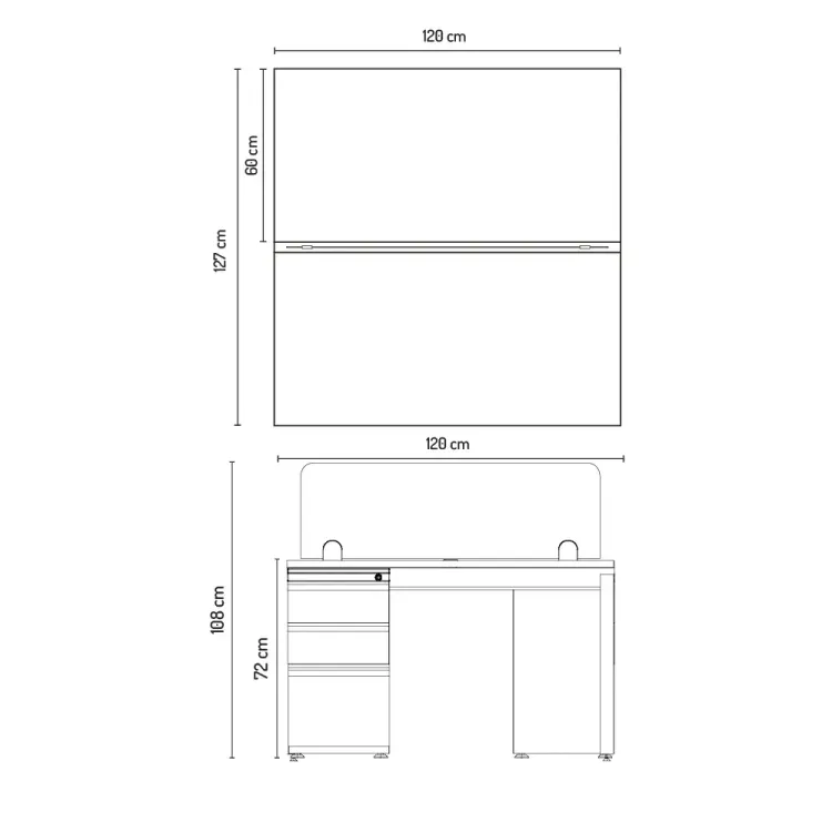 Isla de Trabajo 2 Puestos Maka Blanco , con superficie en aglomerado de madera de 19 mm y estructura metálica cubierta en pintura electrostática. División en acrílico de 4mm. Cada puesto de trabajo incluye cajonera.