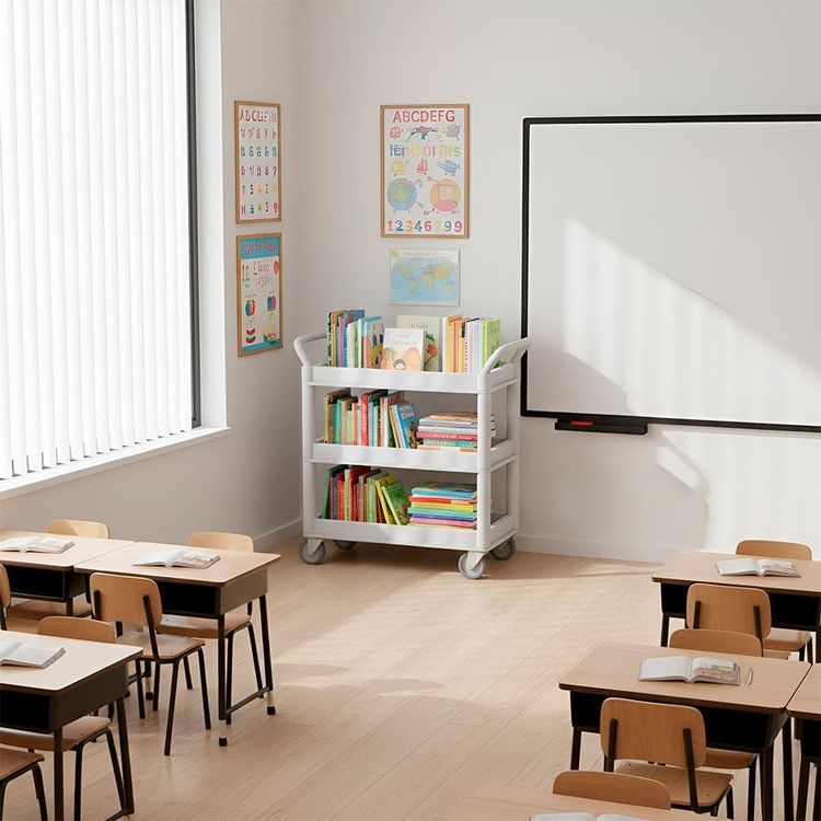 El mueble móvil de laboratorio es un carro metálico diseñado para transportar y organizar materiales dentro del laboratorio. Cuenta con tres bandejas de almacenamiento, manijas laterales y ruedas con freno que permiten mover equipos e insumos de forma segura y práctica en entornos educativos.