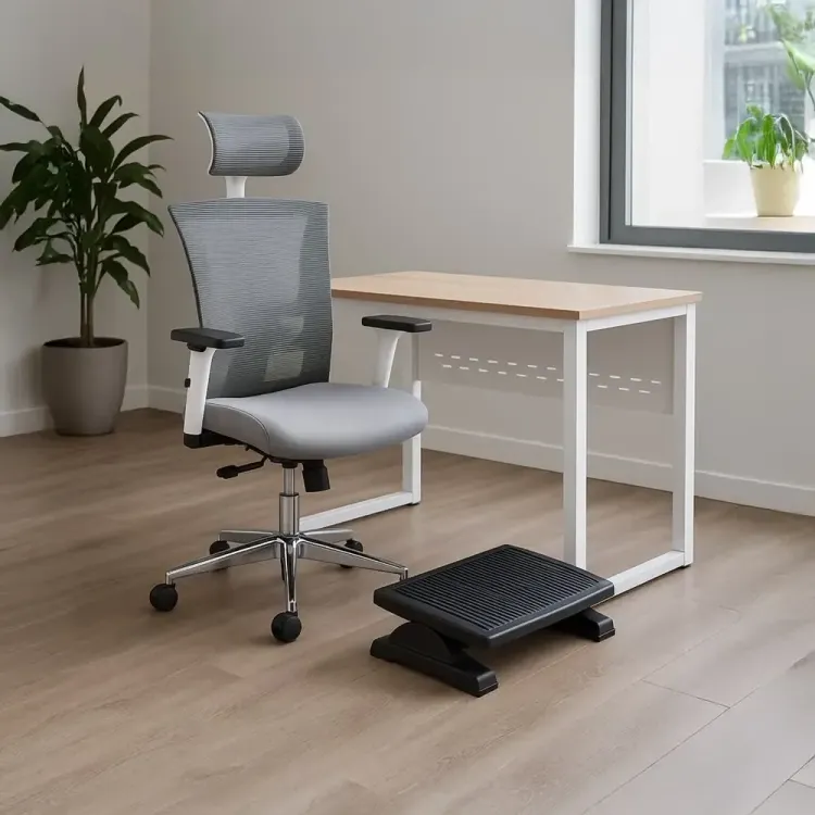 El Set Operativo Chalett combina diseño, ergonomía y funcionalidad para que trabajes con mayor comodidad todos los días. Incluye la silla Chalett, con espaldar en malla gris, soporte lumbar 2D y cabecero ajustable; un escritorio tipo C con faldón metálico negro y superficie resistente; y un reposa pies Basic que mejora tu postura durante la jornada.