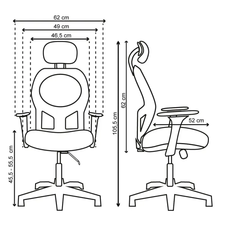 - Asiento: Interno en polipropileno abollonado con espuma inyectada de alta densidad. Tapizado en malla antitranspirante cubierta de telescopio en polipropileno de excelente calidad. Graduación en altura mediante palanca que activa el cilindro neumático.