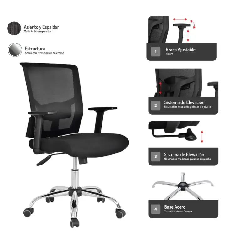 - Asiento: Interno en polipropileno abollonado con espuma inyectada de alta densidad. Tapizado en malla antitranspirante cubierta de telescopio en polipropileno de excelente calidad. Graduación en altura mediante palanca que activa el cilindro neumático.