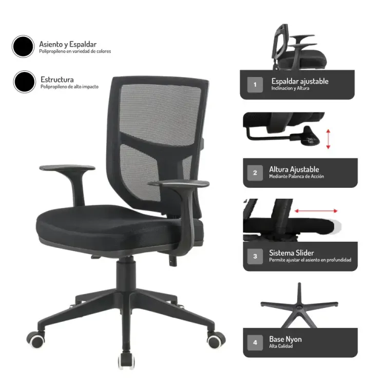 La Silla de Escritorio Livorno destaca por su innovador mecanismo slider, que permite ajustar el asiento hacia adelante o hacia atrás, garantizando una postura personalizada y ergonómica para cada usuario. Además, su espaldar en malla transpirable no solo ofrece un soporte óptimo, sino que también asegura la ventilación. Con la sillas para oficina Livorno, tendrás una silla que se adapta a ti, mejorando tu bienestar y productividad en el entorno laboral.