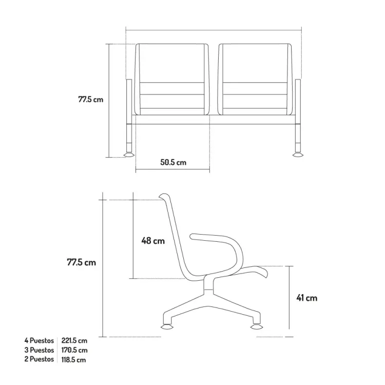 Silla de Espera Aeropuerto Dos Puestos es una solución práctica y cómoda para salas de espera modernas. Totalmente tapizado, ofrece un soporte ergonómico que asegura el confort de los usuarios durante la espera. Su diseño funcional y elegante lo convierte en la opción perfecta para aeropuertos, terminales y otros espacios públicos que priorizan la comodidad y el estilo.