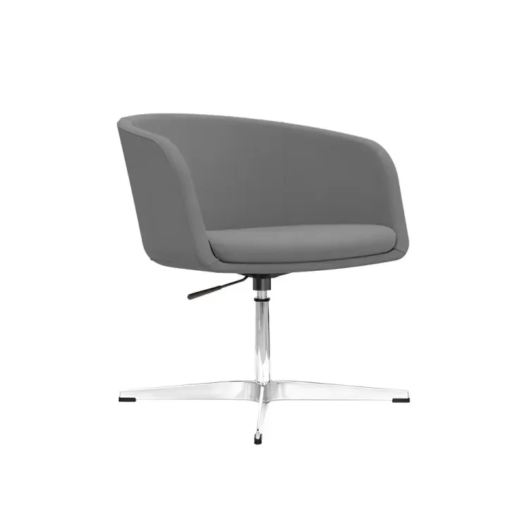 Silla poltrona boom giratoria tapizada en textil, con base metálica brillante. Ajuste de altura y diseño moderno para oficinas, salas de espera o espacios creativos.