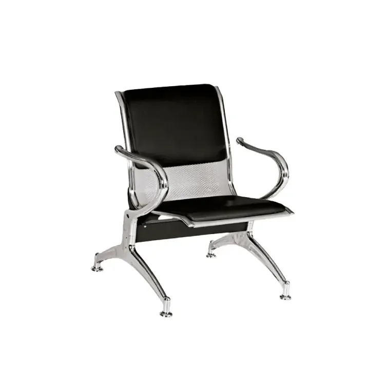 Ideal para sala de espera metálica con espuma inyectada y tapizada en cuero sintético. Estructura metálica con patas en acero cromado terminación cromo.